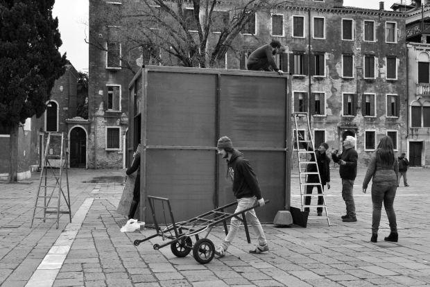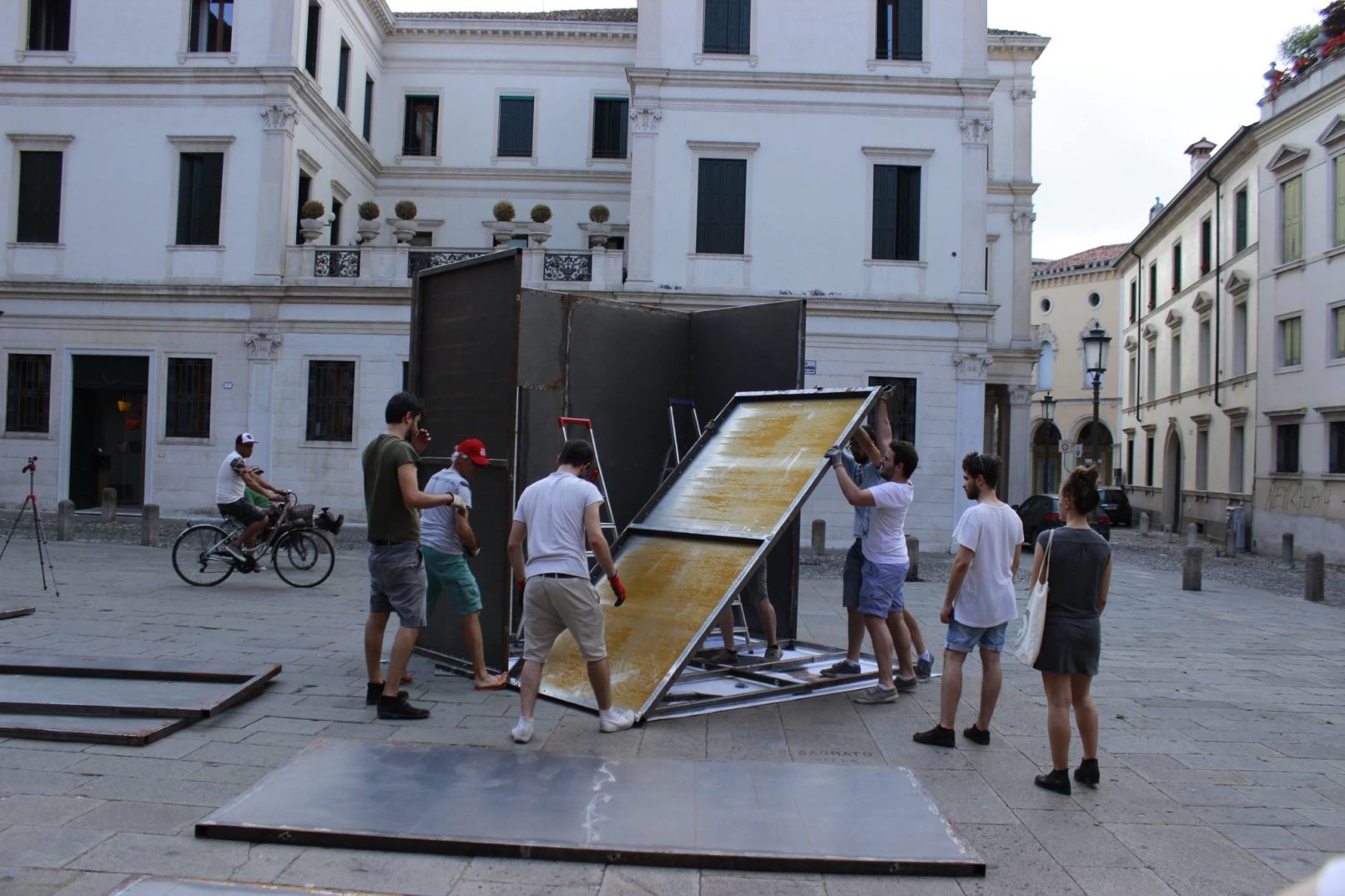 A cube of 3m sides is assembled in a public space, it lasts there for few days, then it is disassembled and brought to a different city. Every day it opens and provides a place for artists to experiment with immediate audience feedback and create collaborating together.