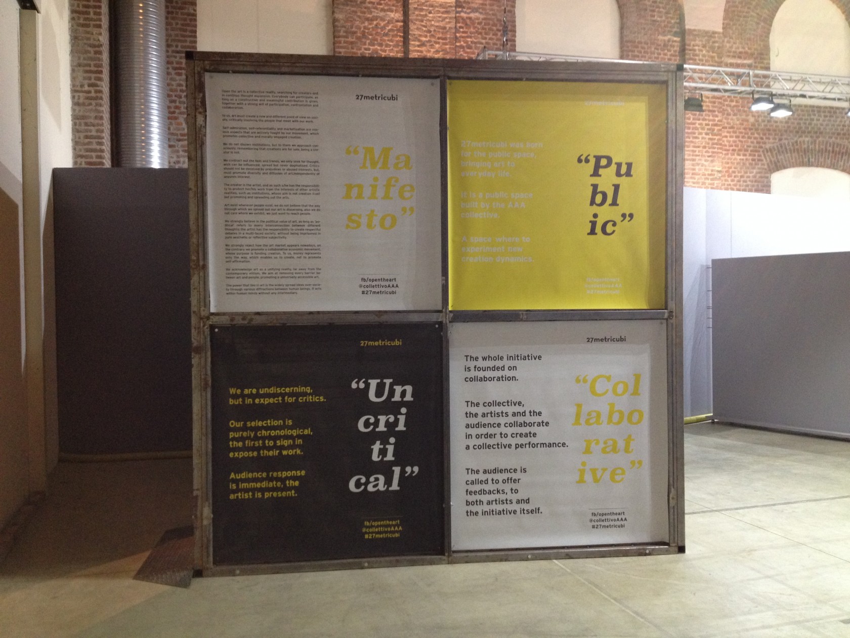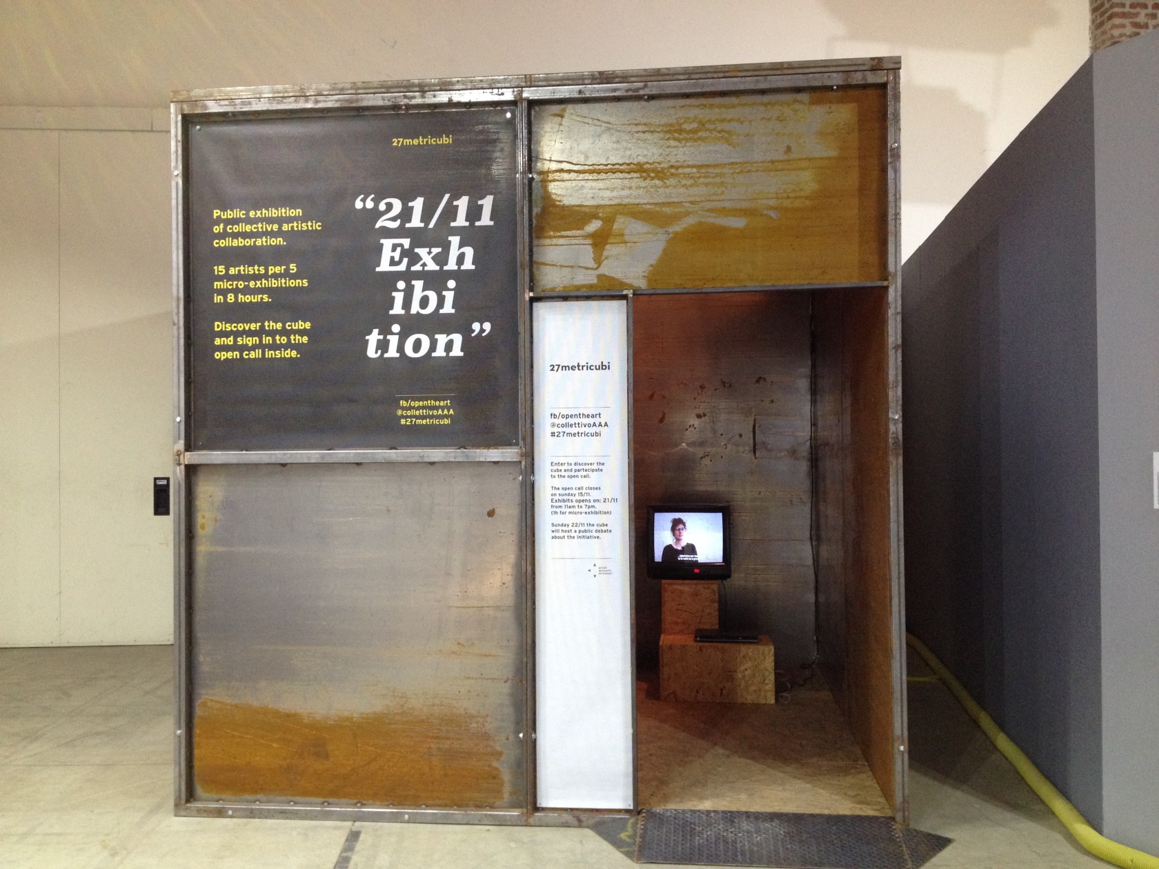 27metricubi was selected to be part of the Young Artist Biennale (Mediterranea 17′) and was included in exhibition at Fabbrica del Vapore, an internationally renowned exhibition space. In this instance the cube acted as a back-door, allowing artists to exhibit in an international exhibition without being selected by the official jury. The number of artists for each exhibition decreased further and the amount of time given to them to get known the “space” and each others increased.