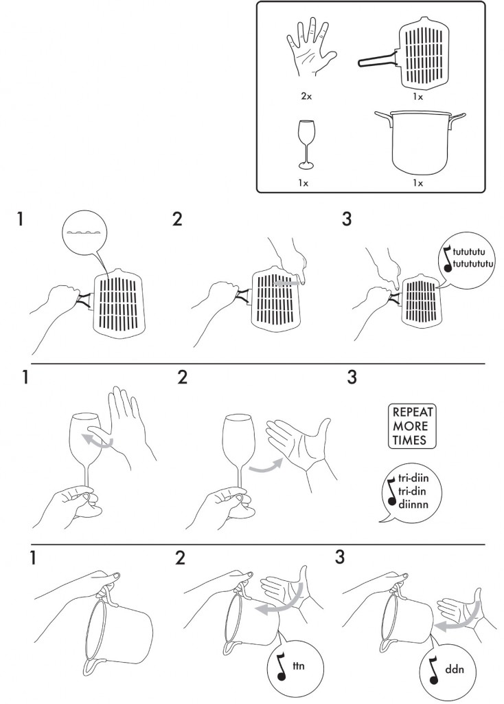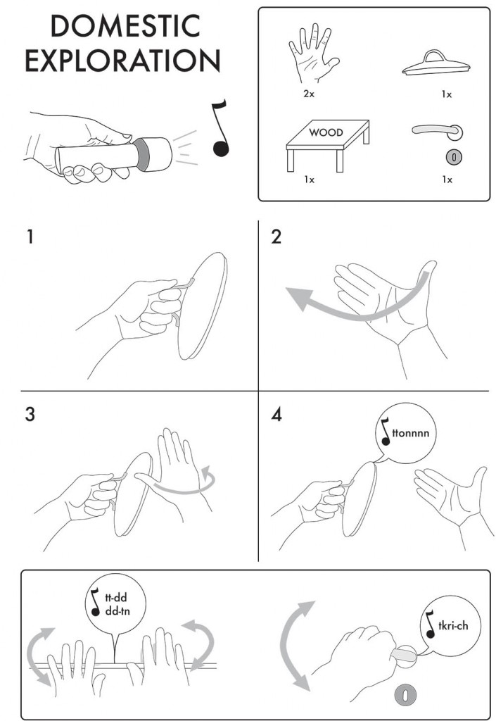 An acoustic performance exploration was made the day before the opening of the show to the audience. In this action Mazzaro explored the surfaces and objects inside the gallery beating and playing with them, in order to know which sound they make. In the first room of the gallery the audience finds the pieces of Marcella and can hear as a soundtrack the audio recording during the performance. In the other room there were the video of the performance – without the audio- and two posters that, as an illustrated manual, described how to explore domestic tools as sound instruments. The video was made when the exhibition was already set, and the spaces explored in the performance are the same spaces where the audience sees the whole show and so the video. This create a short circuit that makes the audience sees in a different way the space and the elements inside the gallery, focusing on elements that otherwise they would have never seen. At the same time seeing how these elements and surfaces sound, the spectators grow the curiosity to try them as well.