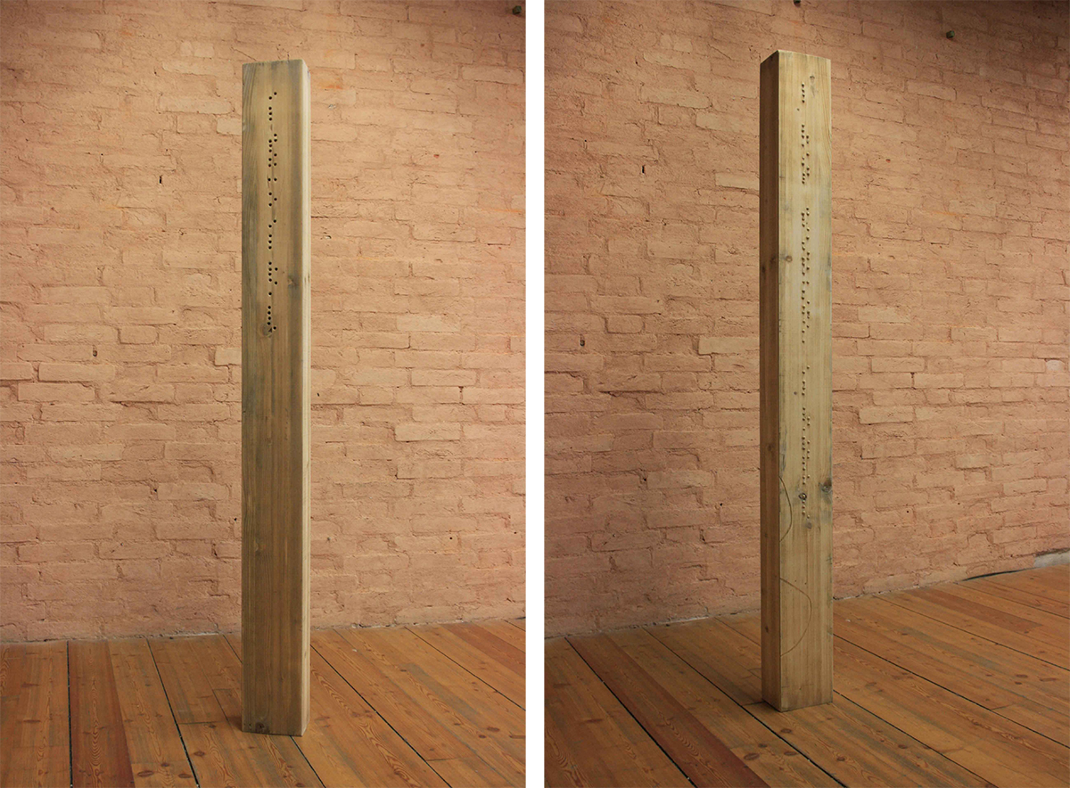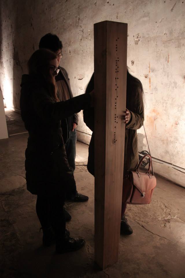 A seeing person and a blind person, one in front of the other, divided by just a beam, they can not see their face but they are connected by the touch of the same matter. A writing in Braille language, divided in two parts, it is written on two opposite sides of the beam. The first part “ The sight testifies to the virtual”, is in relief and it will be read by the blind one, the second one “the touch testifies to the reality”, is carved and it will be read by the seeing one. After the reading that activates the work, the audience is free to touch and read the sentence.