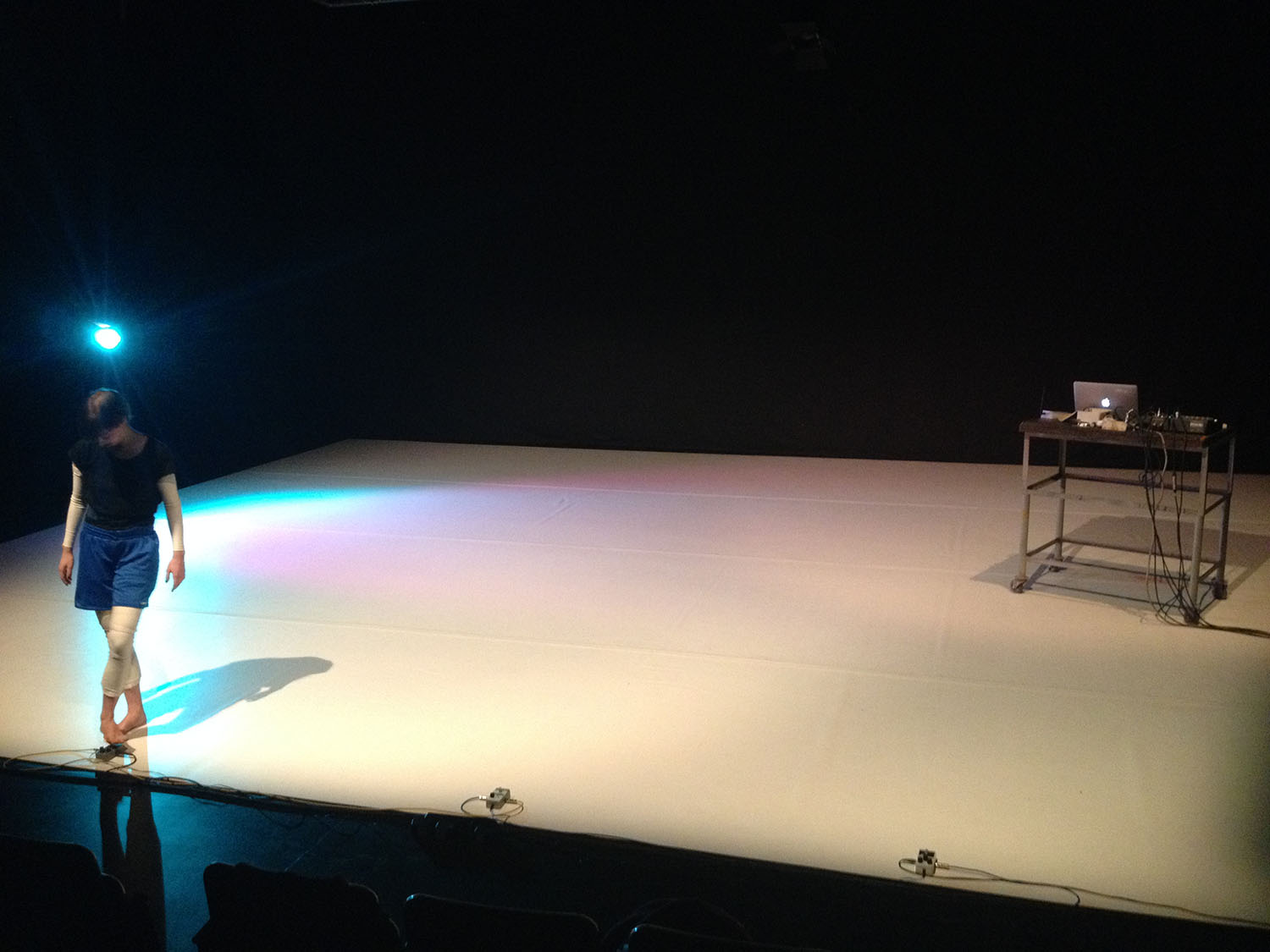 At this point thanks to different choreography residencies, we started to work with the Dancer Elisa D’Amico to compose the final performance. It is a game between a sound designer and a dancer. The test of a relationship, a language made of connections between sounds and movements. An ironic thought about our behavior towards the technology we have created and the desire to be independent from it. On the stage, an inventor dj faces a dancer. She is wearing the system. He tunes her and starts the game. She can become 9 different audio instruments. He chooses the instrument, she plays. He chooses the instrument, she finds a movement to stop the sound. A body finding its relationship with a sound produced by itself. A body fights against it. A tug of war. Harmony and Contrast. Music composition and Choreography. How is in charge?